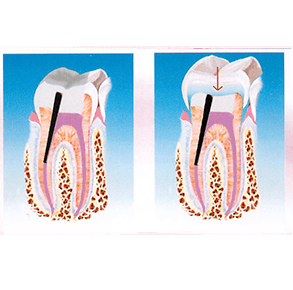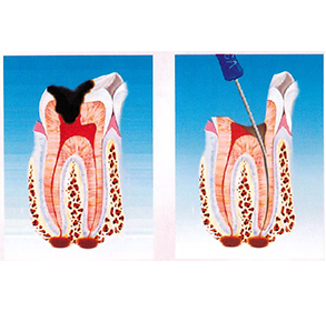 Per un dente con infezione causata da carie profonda viene fatta un’apertura attraverso la corona, per raggiungere la camera palpare (si necessita di anestesia locale) e si effettua una terapia canalare del dente. Successivamente viene rimossa la polpa, il canale radicolare è pulito, allargato e preparato per essere riempito. Normalmente, tra una seduta e l’altra sulla cavità del dente viene messa della pasta provvisoria.